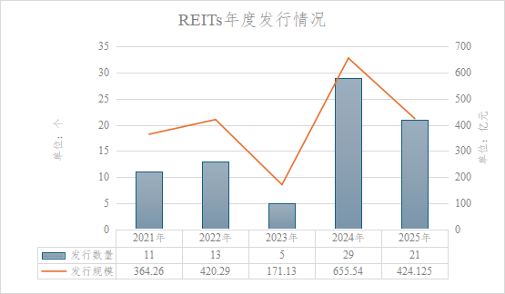 自2021年6月首批基礎設施REITs產品在滬深交易所成功上市以來,每年均有REITs產品發(fā)行上市,且自2024年項目常態(tài)化發(fā)行后,發(fā)行數(shù)量及規(guī)模相較于前三年均有較大幅度增長。