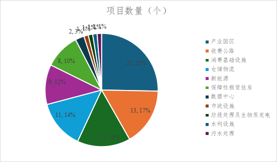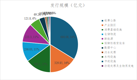 從發(fā)行規(guī)??矗召M公路類項目占比最大,達到34%;產業(yè)園區(qū)和消費基礎設施緊隨其后,占比分別為16%和15%,前三類項目合計發(fā)行規(guī)模約1320億元,占總規(guī)模的65%。